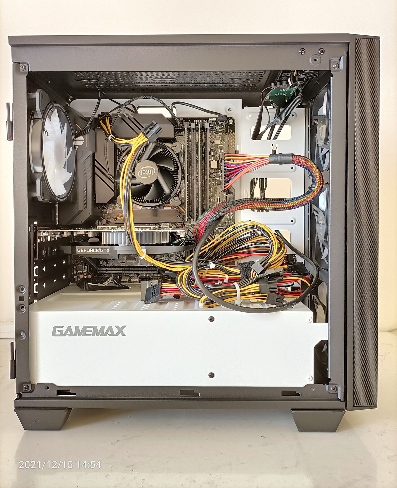 接着進行組裝,這次選定 GameMax 機殼的原因是:它內建 4 個散熱風扇,且支援 AURA Sync 情境燈,側邊的強化玻璃門可開啟,除了方便維修外,也可欣賞到 AURA Sync 七彩多變的燈光秀。