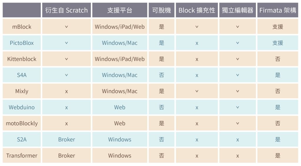 Block 雖然簡化了語法,但就邏輯設計的角度看來,它和 Syntax 是相同的概念。坊間 Block 編輯器非常多,像是Scratch、mBlock、Kittenblock、Mixly、Webduino、PictoBlox、MakeCode、S4A、S2A 等…,能搭配使用的硬體開發板(Arduino/ESP8266/STM32/ Micro:bit…)也非常多,能使用的開發設備(PC/iPad/Chromebook…)也有很多款式,我們要如何挑選呢?